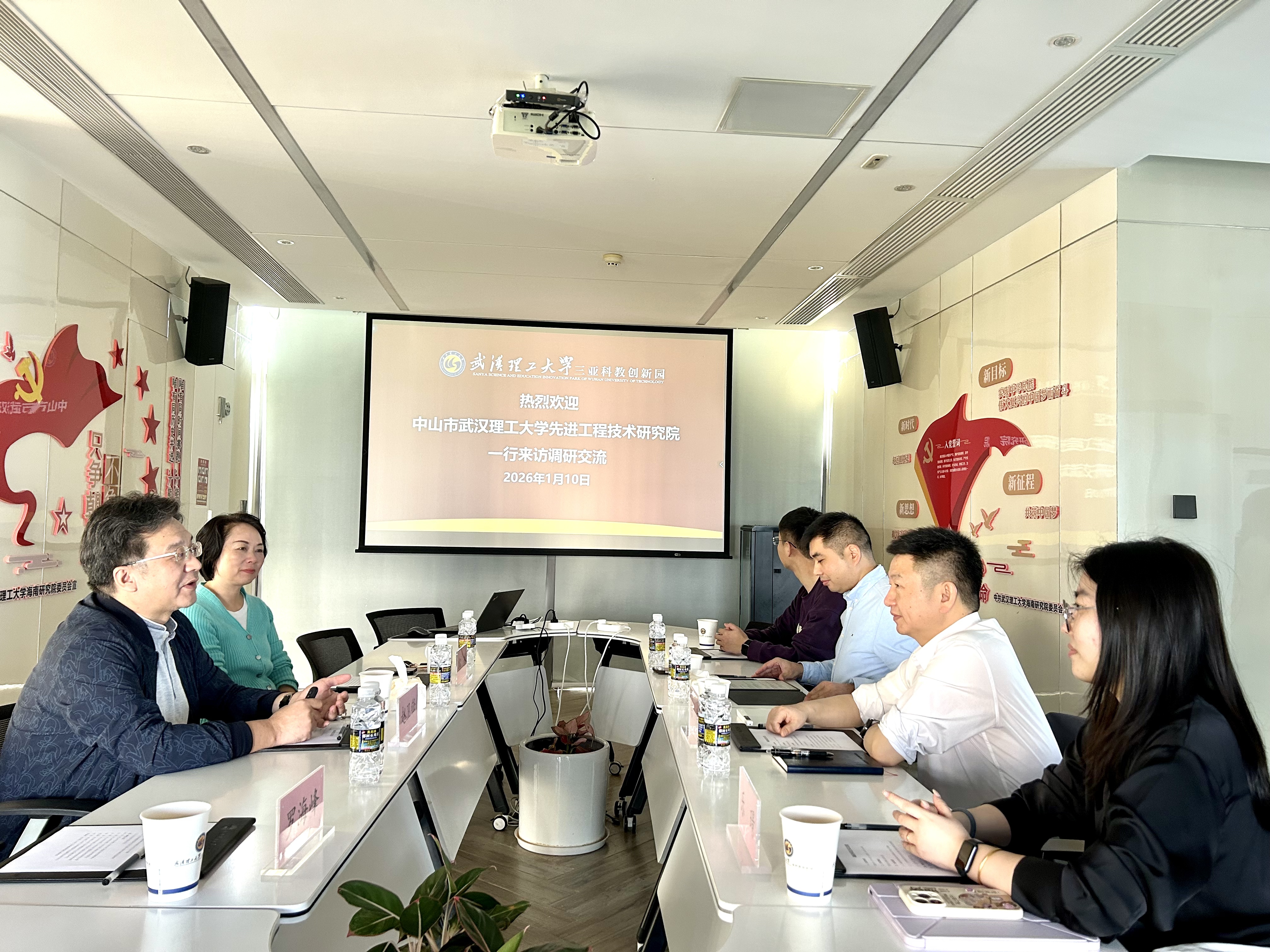 中山市武汉理工大学先进工程技术研究院研发主管乐璟、科研助理杨俊,三亚科教园副主任邱创、综合管理部罗海峰等参加了此次调研交流会议。