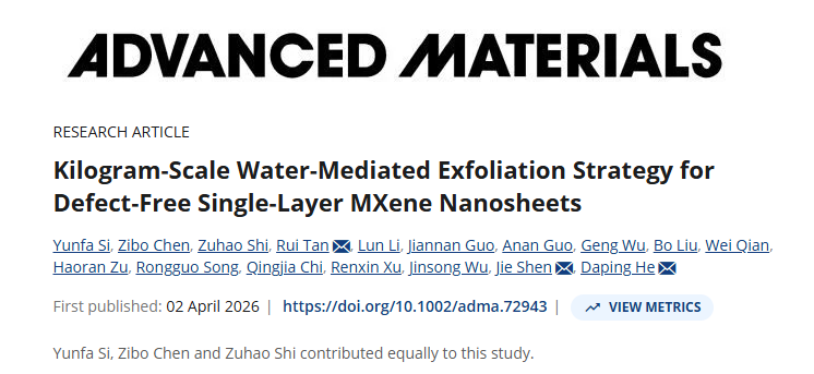 近日,我园何大平教授团队在二维材料制备领域取得重大突破,实现了公斤级无损MXene纳米片的扩展合成。相关研究成果以“Kilogram-Scale Water-Mediated Exfoliation Strategy for Defect-Free Single-Layer MXene Nanosheets”为题,我园为第一完成单位发表在材料科学领域TOP期刊《Advanced Materials》上。海南专项博士研究生司运发、陈子柏,以及武汉理工大学博士后史祖皓为本文的共同第一作者。