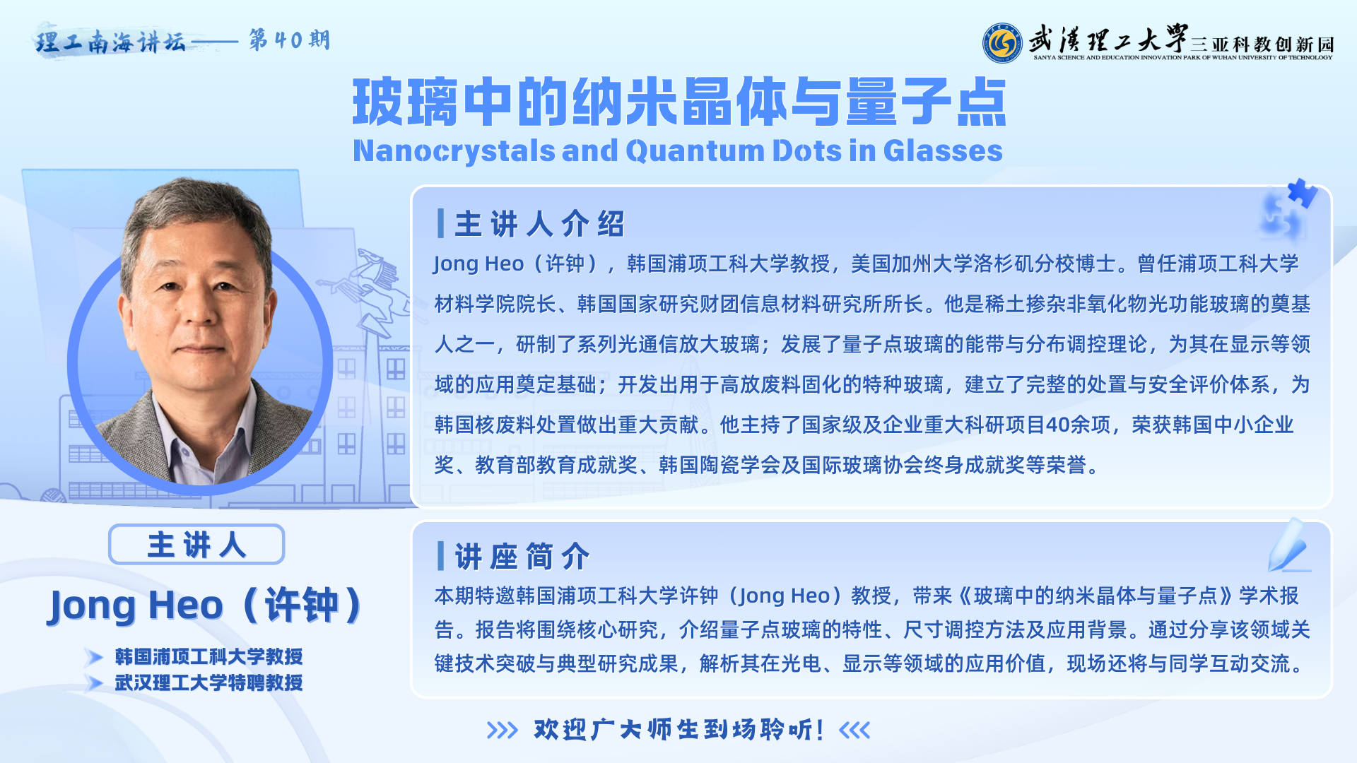 1月7日上午,韩国浦项工科大学Jong Heo教授(许钟教授,韩国)应邀做客第四十期“理工南海讲坛”,在研学谷S0104教室作了题为“玻璃中的纳米晶体与量子点”(Nanocrystals and Quantum Dots in Glasses)的学术报告。