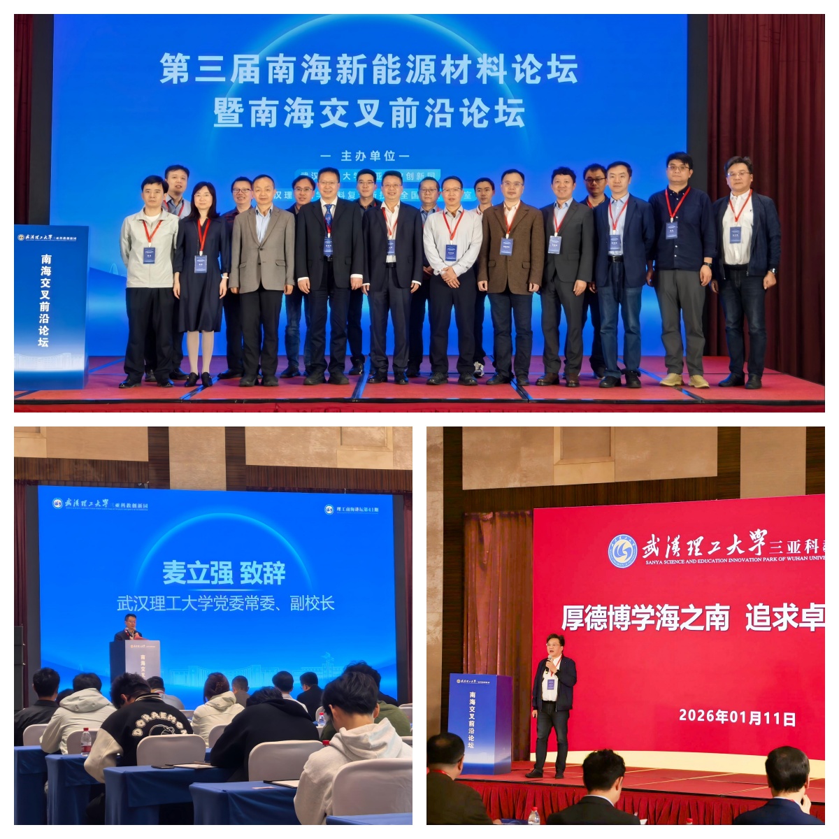2026年1月11日,理工南海讲坛第41期:第三届南海新能源材料论坛暨南海交叉前沿论坛在三亚崖州湾希尔顿格芮精选酒店顺利召开。本次论坛由武汉理工大学三亚科教创新园主办,是“理工南海讲坛”第41期活动,本届论坛聚焦新能源材料领域的前沿科学与技术,汇聚了来自国内顶尖高校与科研机构的十余位知名学者,围绕前沿技术与交叉应用展开深度研讨。