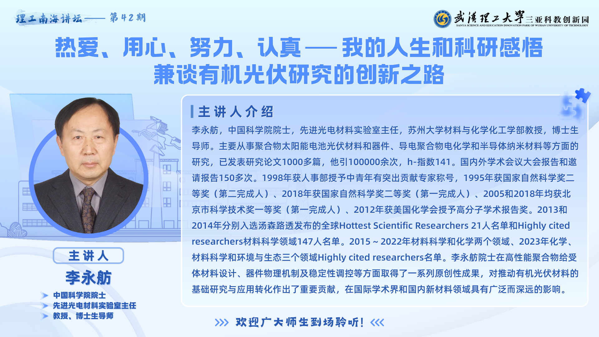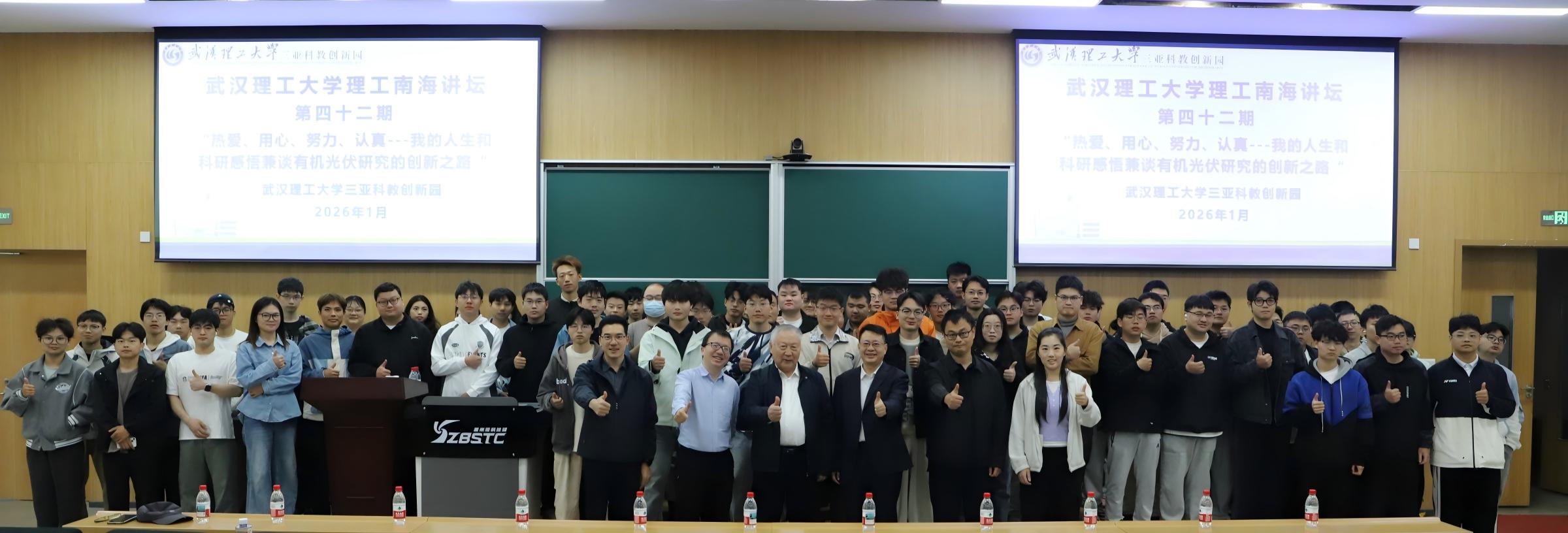 近日,中国科学院院士、我国有机光电材料与器件研究领域的杰出学者李永舫教授,应邀做客第四十二期“理工南海讲坛”,在研学谷S0104教室为在场师生带来了一场题为《热爱、用心、努力、认真——我的人生和科研感悟兼谈有机光伏研究的创新之路》的精彩学术报告,武汉理工大学党委常委、副校长麦立强教授主持。报告厅内座无虚席,气氛热烈。