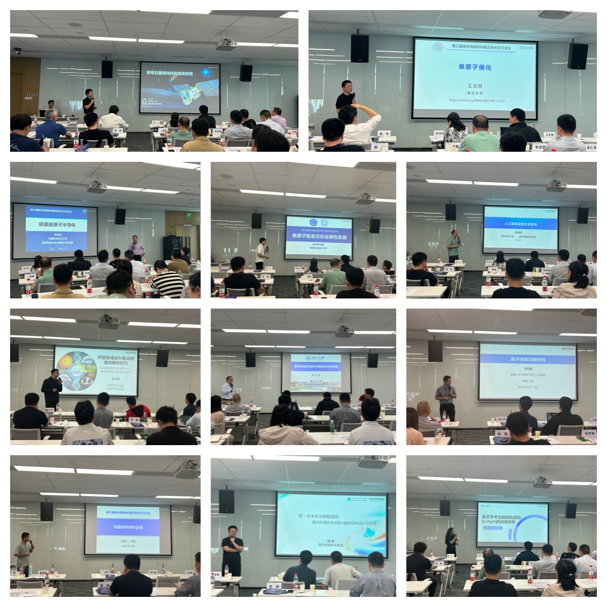 学术报告环节精彩纷呈,多领域专家进行了深度分享。何大平教授以“宏观石墨烯材料的应用探索”为题,系统阐释了石墨烯在智慧农业等领域的应用前景。王定胜教授、朱彦武教授分别就单原子催化、碳基超原子半导体等前沿方向展示了最新研究成果。闫勇老师、袁晓辉教授围绕单原子智造与农业绿色发展、AI与生物技术融合等议题分享了创新实践。刘小磊教授深入剖析生成式AI驱动的遗传解析技术。孙文平教授聚焦氢能关键催化材料研究进展。张世国教授、洪勋教授分别介绍了离子液体功能材料和非晶纳米材料的研究突破。崖州湾国家实验室郑轶主任专题报告“繁系统——面向区域性农业的AI基础设施设计与实践”,系统呈现海南农业智能化创新布局。Scilight出版社刘小青经理还就英文学术期刊出版合作模式进行了专业分享。