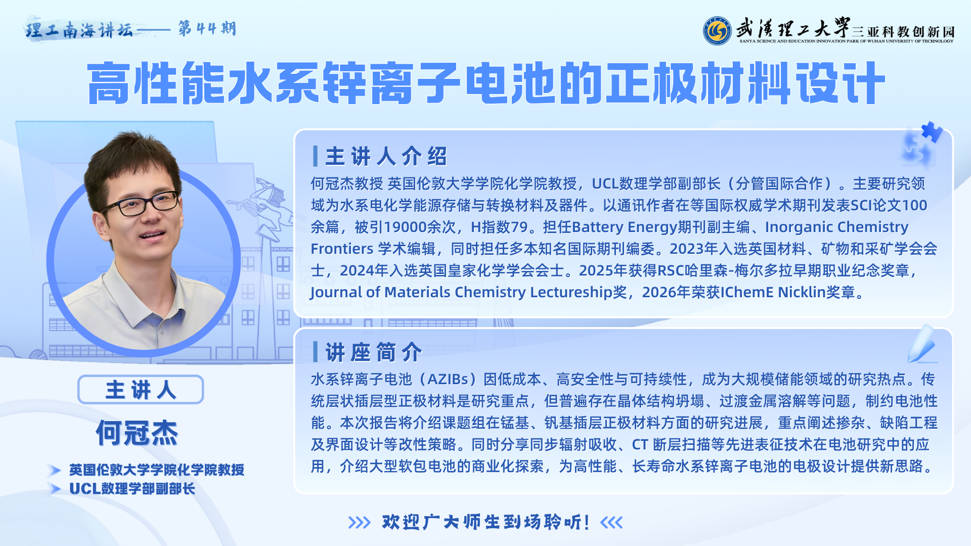 3月30日下午,英国伦敦大学学院化学院教授、数理学部副部长何冠杰教授受邀做客第四十四期“理工南海讲坛”,在创新研学谷作题为《高性能水系锌离子电池的正极材料设计》的学术报告。